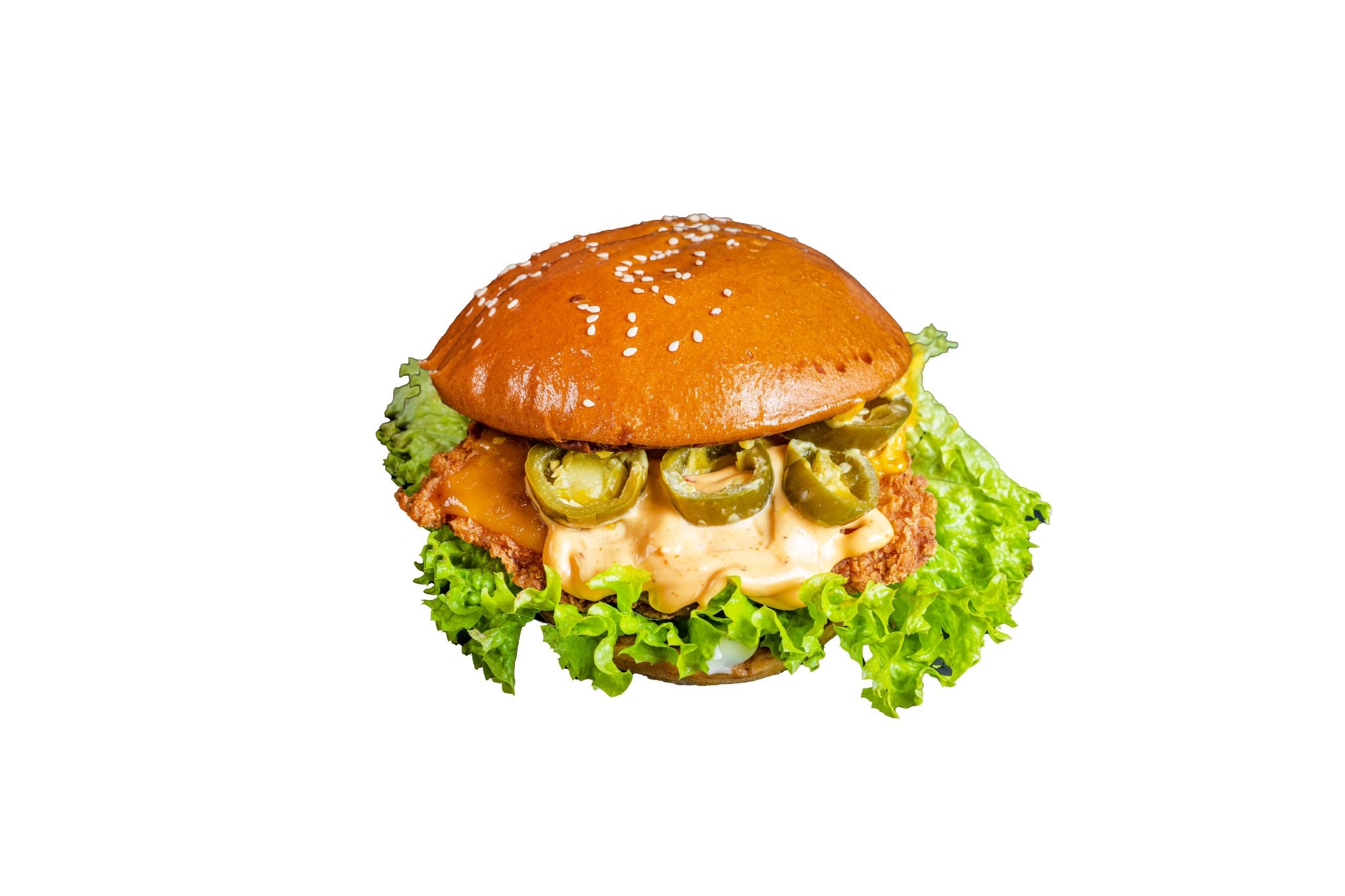 🔥 Der Hot-Star unter den Chicken Burgern! Knuspriges, goldbraun gebratenes Hähnchenfilet, überzogen mit geschmolzenem Käse, knackigem Salat und feurigen Jalapeños für den extra Kick. Abgerundet mit unserer cremigen Special-Soße.
