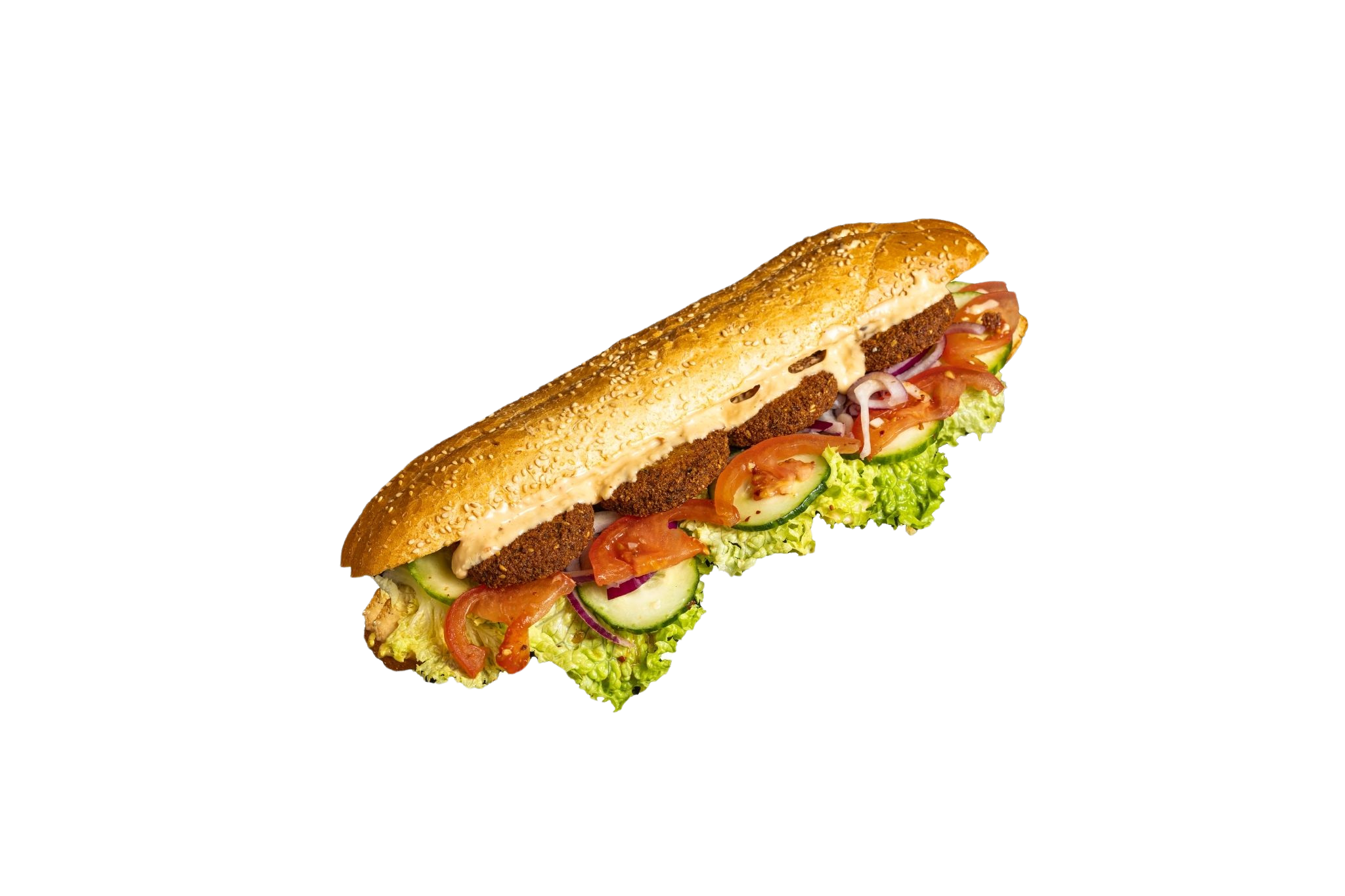 Unser Falafel Baguette bietet eine köstliche fleischlose Option mit knusprigen C-Falafeln, geschmolzenem Käse, frischem Salat und unserer hausgemachten Soße.